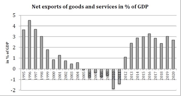But are the northern clichés true? No, most are not. Few people in northern Europe will be aware that there is no tax money flowing from their countries to Italy in the first place, because it has been a net contributor to the EU budget since at least 2000. It is also rather a stretch to call Italians lazy, considering it is the second industrial producer of the EU (after Germany) and Italy’s balance of trade for goods and services has been positive for most of the past decades (see figure below from the very useful overview by Heimberger 2021, data also from Worldbank) – which, incidentally, also makes Italy a net exporter of capital.