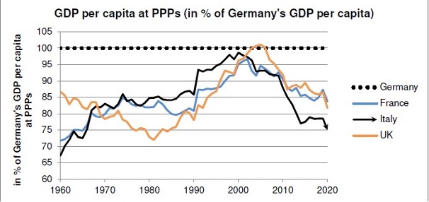 But although Italy stuck to the EMU rulebook as well as Germany did, and continued to do so after the financial crisis hit, the results were quite different as we can see in the picture above showing Italy’s rising debt load since 2009, and in the picture below of GDP per capita (from Heimberger 2021). As argued by Heimberger, Italy’s living standard rose during the nineties to a level virtually equal to that of Germany by 2000, but fell behind ever since and by 2020 was 25% under Germany’s (see picture below).