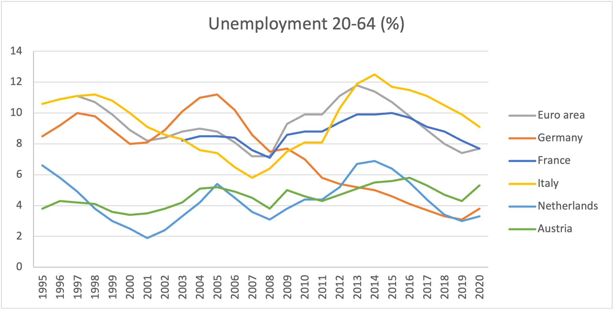 There are several explanations that have been put forward for these different results. One is that the strong emphasis on cost reduction in Italy has reduced public investments and also domestic demand in Italy itself, which led to economic stagnation (see e.g. Baccaro & D’Antoni, 2020). Thanks to the reduction of job protection, downturns also lead to immediate lay-offs, whereas in Germany employment moves from the manufacturing to the services sector, which is less dependent on export but where wages are lower. Lower unit labour costs also make it less interesting to invest in education and training which in the long run improve productivity.
