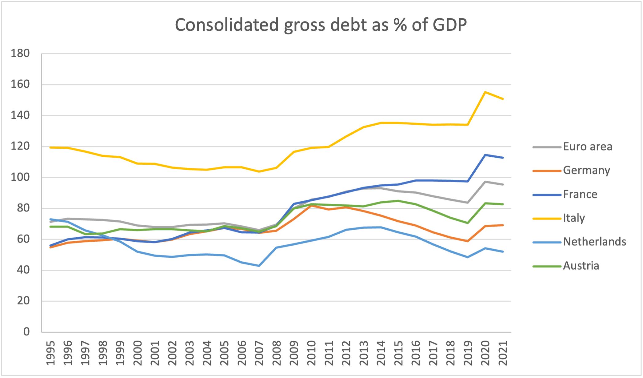 As the picture below (data from Eurostat, extracted 23-9-2022) shows, Italy managed to bring down its legacy debt from the nineteen eighties by almost 20% until the financial crisis started in 2008.